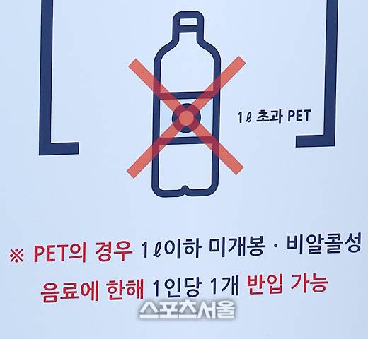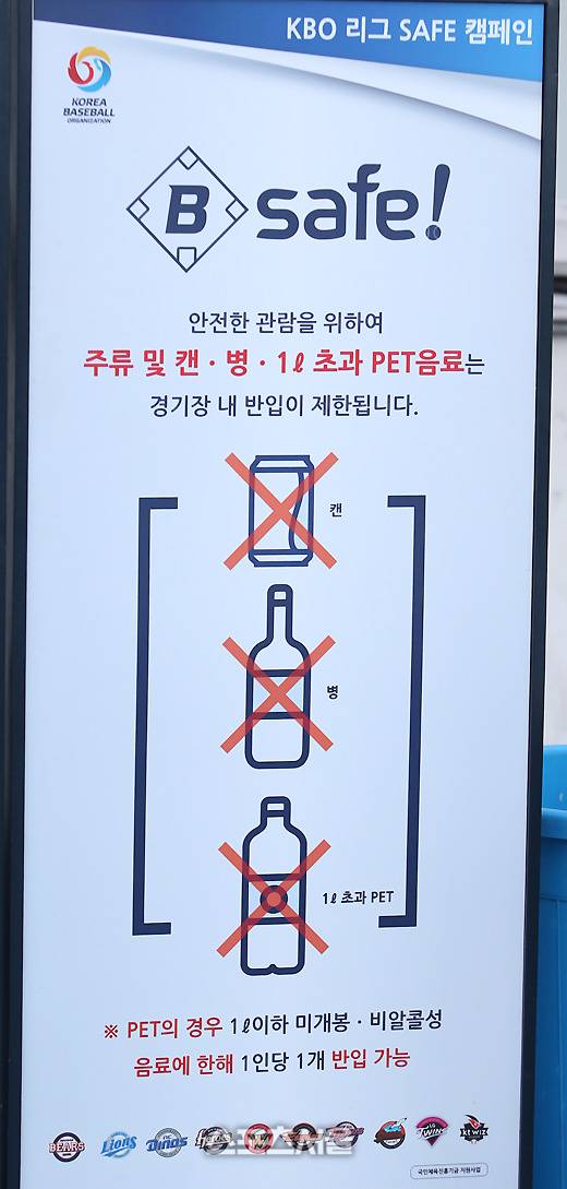 주류 및 캔, 병, 1리터 초과 PET 음료는 경기장 내 반입이 제한된다. 아울러, PET의 경우 1리터 이하 미개봉과 비알콜성 음료에 한해 1인당 1개 반입이 가능하다. 참고로, 1리터 이하 PET 맥주는 반입이 가능하다. 물론, 미개봉 상태일 때 가능하다.