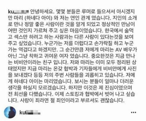 이 게시물에는 "쿠시는 일본의 AV 배우 '마리'(하네다 아이)와 과거 연인 사이였고, 두 사람은 이미 정리된 관계다. 마리가 쿠시의 현 여자친구 비비안과 기자들에게 온갖 사진들을 보내겠다며 쿠시를 괴롭히고 있다"는 내용이 담겨 있다.