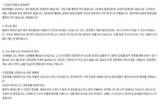 발화의 특성상 같은 말도 받아들이는 사람마다 다르게 이해할 수 있습니다. 이는, 정준영이 무혐의를 받더라도, 제가 무고죄가 아닐 수 있는 이유입니다. 단순한 흑백논리로 생각하지 않아주셨으면 합니다. 저에게 무고죄라는 둥 상처받는 말을 하지 마십시오. 비록 글로 인사드리지만, 저도 사람이고 마음이 여린 한 여자입니다.
