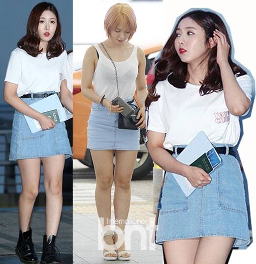 여자친구 멤버 신비와 AOA멤버 초아는 데님 스커트로 공항 패션을 완성했다. 신비는 화이트 반팔 티셔츠와 A라인 데님 스커트를 입고 입술에 포인트를 준 메이크업으로 베이직한 스타일링을 선보였다. 여기에 블랙 워커와 벨트를 매치하는 센스로 세련된 감각을 뽐냈다.
