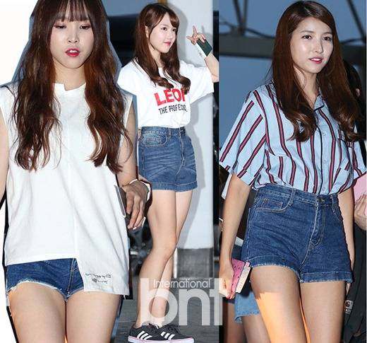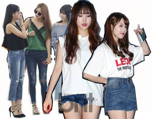 데님 숏팬츠는 블라우스, 티셔츠 할 것 없이 두루 잘 어울리고 매치하기 쉬워 여름에 사랑받는 아이템 중 하나. 여자친구의 멤버들은 각자의 개성대로 데님 숏팬츠를 소화해 냈다.
