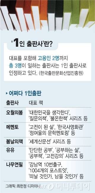 한국출판문화산업진흥원에 따르면 '1인출판사'는 대표 포함 총 3인 이내 근무자가 종사하는 출판사를 일컫는다. 기획, 편집, 홍보까지 '일인 다역'을 수행하는 경우가 대부분이다. 책을 내는 데 집중하다 보면 중대형 출판사에 비해 상대적으로 마케팅·홍보에 여력이 없다는 것이 1인 출판 관계자들의 공통된 전언이다.