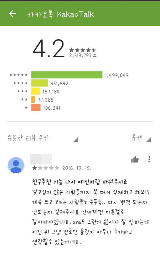 19일 업계에 따르면 카카오는 지난 18일 친구찾기 메뉴 등을 개편한 '5.9.0버전' 업데이트를 실시했다. 카톡의 새로운 '친구 추천' 기능은 사용자 사이에서 엄청난 논란을 불러일으켰다. 업데이트 직후 구글플레이와 인터넷 커뮤니티 게시판, 소셜네트워크서비스(SNS) 등에는 카톡의 새로운 기능에 대한 이용 후기가 줄줄이 올라왔다. 회사원 최모(31) 씨는 "그간 업무용과 일상용으로 스마트폰을 나눠 써왔는데, 일상용에도 직장상사와 동료의 카톡 ID가 떠 난감하게 됐다"고 말했다. 대학생 이모(24) 씨는 "예전 남자친구와 좋지 않게 헤어져 번호를 바꿨는데 다시 카톡에서 전 만나게 됐다"며 황당해 했다. 이 밖에도 스토커로 삭제한 사람이 다시 카톡 친구로 나왔다 등의 불만이 이어졌다. 또 일각에선 이 기능을 통해 원치 않는 스팸 광고가 범람할 수 있고, 유해물이 확산하는 창구로 사용될 수 있다는 우려의 시각도 제기했다.
