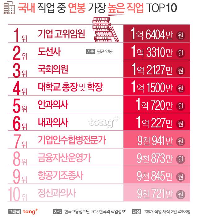 국내 직업 중 연봉이 가장 높은 직업 1위는 '기업 고위임원'으로 1억6404만원에 달했다. 이어 항만·운하·강 등에서 선박을 안전한 수로로 안내하는 '도선사'가 1억3310만원, '국회의원' 1억2127만원, '대학교 총장 및 학장' 1억1500만원, '안과의사' 1억720만원, '내과의사' 1억227만원, 기업인수합병전문가 9천941만원 순이었다.