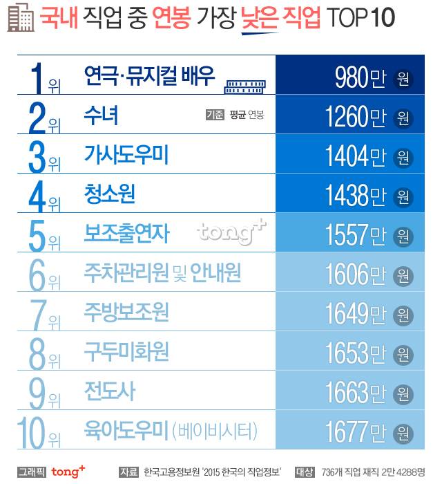 연봉 높은 직업 1위는 '기업 고위임원', 연봉 가장 낮는 직업은? 국내 직업 중 연봉이 가장 낮은 직업 1위는 '연극·뮤지컬 배우'로 980만원에 불과했다. 이어 '수녀' 1260만원, '가사도우미' 1404만원, '청소원' 1438만원, '보조출연자' 1557만원, '주차관리원 및 안내원' 1606만원 순이었다.