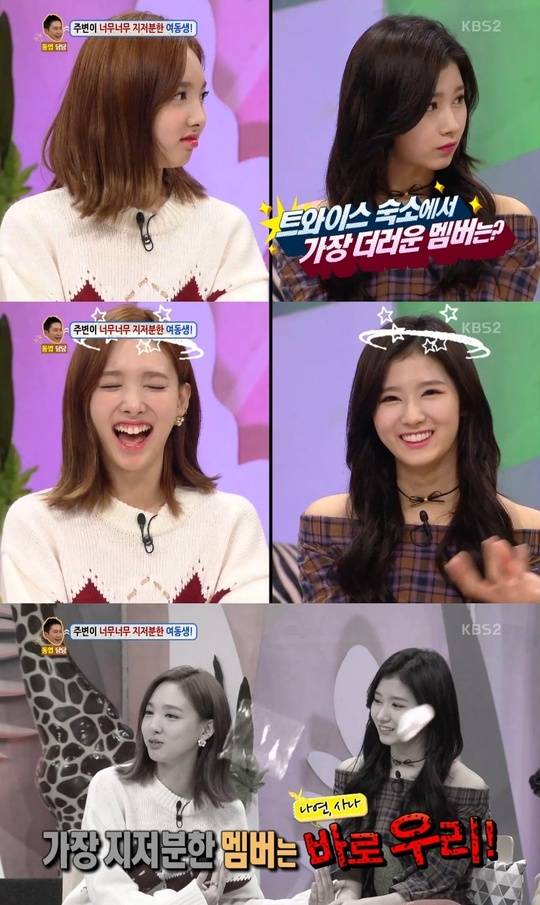 MC 최태준은 "트와이스 멤버들 중 가장 숙소에서 안 치우는 멤버가 누구냐"고 물었다. 나연은 "가장 깨끗한 멤버가 있는데 그 멤버가 가장 지저분한 멤버는 우리라고 하더라"며 자신과 사나를 가리켜 웃음을 자아냈다.(사진=KBS 2TV 캡처)