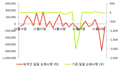 다음 표는 동종목의 외국인, 기관의 일별 순매수량을 나타낸 것이다.