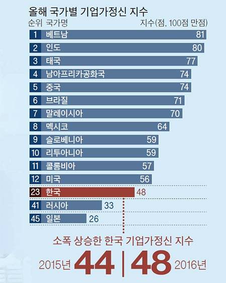 경기 불황이 지속되자 도전보다는 안정을 추구하는 성향이 강해진 거죠. 그래도 한국의 기업가정신지수가 지난해 44점에서 올해 48점으로 약간 올랐다는 점에선 희망의 싹이 보이기도 합니다.