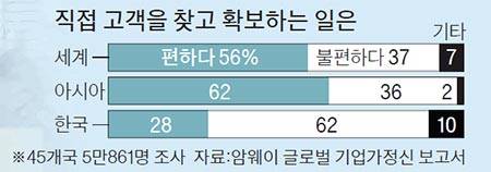 암웨이가 올해 발표한 ‘암웨이 글로벌 기업가정신 보고서’에서도 한국 기업가정신의 위기가 보입니다. 2010년부터 매년 하는 이 조사는 올해는 45개국, 5만861명(만 18~99세)을 대상으로 이뤄졌는데, 한국에선 1500명이 참여했어요. 이 보고서에 따르면 세계인의 평균 77%가 기업가정신을 긍정적으로 인식하고 있지만 한국은 68%에 그쳤어요. 사업을 할 준비가 됐다는 응답은 한국은 24%에 불과해 아시아 전체(38%)나 중국(49%)보다 낮아요. 창업을 위한 중요한 활동인 ‘직접 고객을 찾고 확보하는 것’에 대한 반응도 부정적이에요. 한국은 62%가 불편하다고 응답했어요. 세계 평균(37%)이나 아시아 평균(36%)보다 높죠.