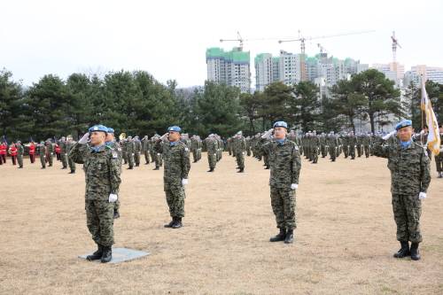 | 2015년 11월 동명부대 17진 환송식에 참석한 동명부대원들이 전방을 향해 경례를 하고 있다. 육군 제공 |
