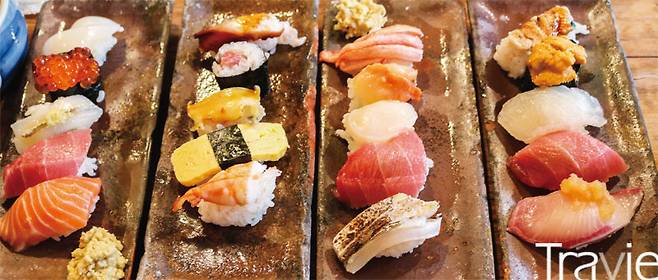 메뉴의 구성도 일반적인 스시집과 다르다. 총 5개의 스시로 구성되어 있는 4개의 플레이트 중 한 가지를 선택해 주문해야 한다. 초밥을 즐기는 순서는 간단하다. 진하게 우린 녹차 한 모금으로 입 안을 헹군 뒤 초밥을 음미한다. 이후 붉은 된장으로 끓여 낸 아카다시국으로 초밥의 풍미를 확산시킨다. 언제나 그렇듯 마지막은 생강 절임인 쇼가로 개운하게 마무리. 2번 플레이트에 속해 있는, 타치우오(갈치) 초밥은 겉면만을 익혀 부드럽고 촉촉한 맛이 일품이다. 초밥의 향을 즐기지 않는다면 타마고(계란), 에비(새우), 아와비(전복) 등 누구나 쉽게 먹을 수 있는 3번 플레이트를 추천한다. 생기 넘치는 아침을 대표하는 수산 시장 옆에 자리잡은 스시집답게 영업시간은 오전 5시부터 오후 2시까지.