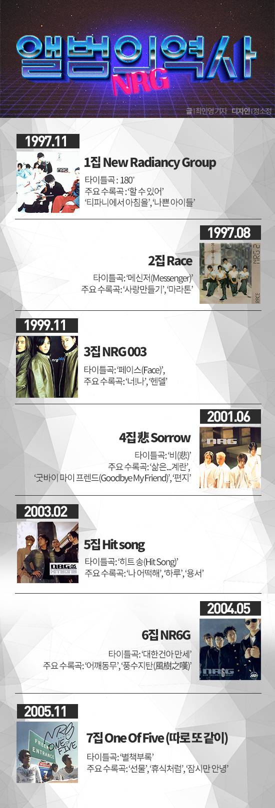 지난 2005년 11월 NRG는 마지막 앨범으로 남아있는 7집 ‘원 오브 파이브(One Of Five, 따로 또 같이)’를 발매했다.