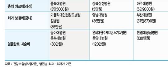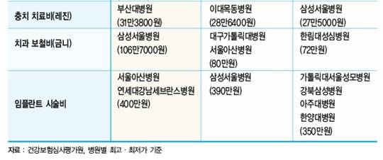 33개 상급 종합병원 중 임플란트 시술비(치아가 없는 턱뼈에 임플란트를 심고 그 위에 치아 형태의 보철물을 씌우는 치료)가 가장 비싼 곳은 서울아산병원과 연세대강남세브란스병원(각 400만원)이었다. 삼성서울병원도 390만원을 받고 있었다.
