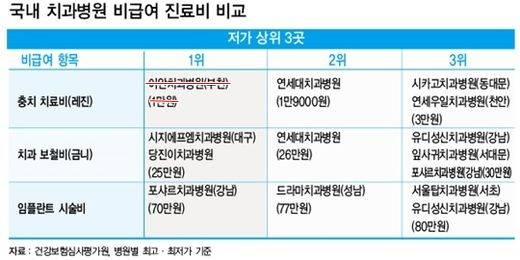 반면 시지에프엠치과병원(대구)과 당진이치과병원은 25만원, 연세대치과병원은 26만원으로 최고가 병원보다 3분의 1 정도 저렴했다.