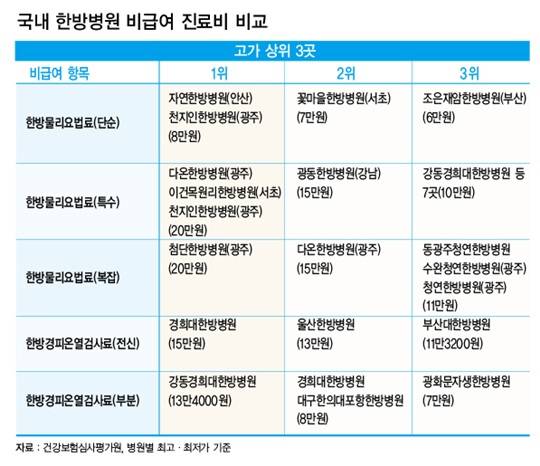 이 중 비용이 가장 비싼 곳은 자연한방병원(안산)과 천지인한방병원(광주광역시)으로, 8만원을 받고 있었다. 꽃마을한방병원(서울 서초)도 7만원을 받고 있었다.