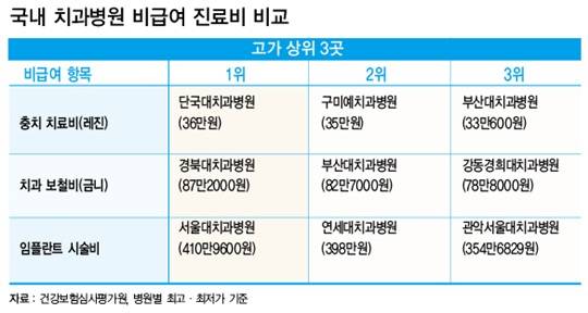 <국내 상급 종합병원 비급여 치과 진료비 상위 3곳>