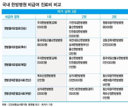 반면 동국대일산불교한방병원의 치료비는 8000원으로 최고가 병원의 25분의 1 수준이었다. 대전대둔산한방병원·삼세한방병원(부산)·울산한방병원도 2만원으로 비교적 저렴했다.