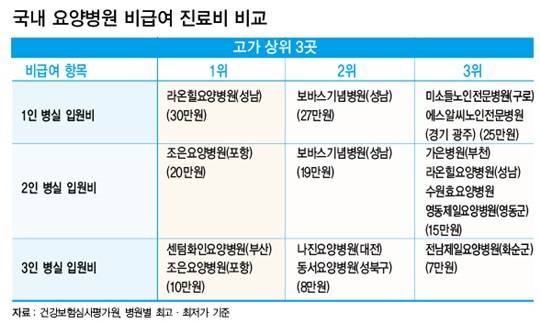 전국 304개 요양병원 중 1인실 입원비가 가장 비싼 곳은 경기 성남의 라온힐요양병원(30만원)이었다. 이어 보바스기념병원(성남)이 27만원으로 둘째로 비쌌다.
