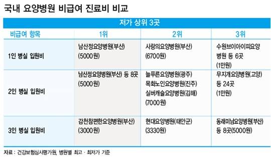 반면 남산정요양병원(부산)의 1인실 입원비는 5000원으로, 최고가 병원의 60분의 1 수준이었다. 사랑의요양병원(부산)도 6700원으로 저렴한 편이었다.