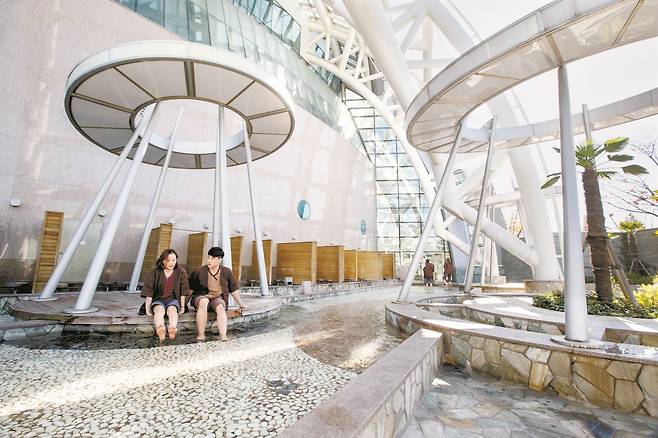 부산 해운대구 신세계백화점 센텀시티의 스파랜드는 젊은 여성에게 특히 인기가 높다. 주말이면 백화점에서 쇼핑을 하고 같은 건물 1~2층 온천에서 피로를 푼다. 깔끔한 시설도 젊은 여성에게 인기를 끄는 요인이다. 스파랜드에는 히말라야에서 공수해온 소금으로 가득한 소금방, 이천에서 생산한 황토로 벽을 칠한 황토방 등 독특한 찜질시설이 12개 있다. 노천탕은 여탕에만 있다. 지하 1000m에서 끓어 올린 온천수는 자극이 없고 부드러워 피부 미용에 좋다고 한다. 스파랜드는 부산의 대표 관광명소와도 가깝다. 해운대해수욕장과 동백섬이 자동차로 15분 거리, 카페가 즐비한 광안리 해변이 10분 거리에 있다. 주중 어른 1만5000원 어린이 1만2000원, 주말·공휴일 어른 1만8000원 어린이 1만5000원. 051-745-2900.