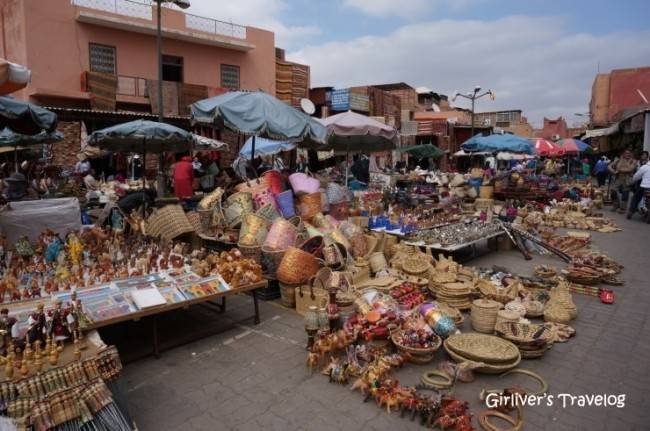 이것으로 메디나의 궁전 투어는 끝난다. 다르 시 사이드에서 수크를 따라 나와보니, 이곳에도 노점이 모여 있다. 바구니며, 가방, 낙타 인형 같은 수제품이 놓여있기도 하고 알록달록한 모자들을 쌓아놓고 파는 곳, 예쁜 접시를 파는 가게, 반짝 세일을 하고 있는 어느 남자의 작은 바구니 앞에서는 티셔츠가 날개 돋친 듯이 팔리고 있다.