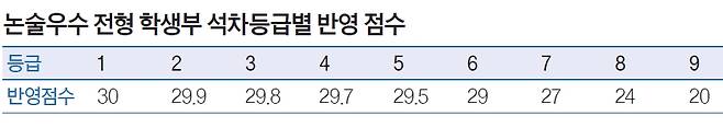논술우수 전형서 인문계 문제 수 3개로 줄어올해 성균관대 논술우수 전형에는 몇 가지 변화가 있다. 먼저 인문계 논술 유형의 변화가 가장 눈에 띈다. 인문계 논술은 기존 네 문제에서 세 문제로 문항수가 줄었다. 시험 시간도 120분에서 100분으로 줄었다. 기존 2, 3번 문제를 한 문제로 합쳤다는 점에서 큰 변화는 아닐 수 있지만 유의해야 한다.학생부 반영 방법에도 변화가 생겼다. 기존에는 상위 10개 과목만 반영했지만 인문계는 국·수·영·사, 자연계는 국·수·영·과 전 과목을 반영한다. 수능 최저학력 기준도 지난해에는 탐구 과목을 각각 한 과목으로 인정했지만 올해는 탐구 두 과목 평균을 활용하는 것으로 바뀌었다. 100점 만점으로 산출했을 때 30점에 해당하는 학생부 교과 성적은 석차등급에 따라 반영된다. <표 참조>