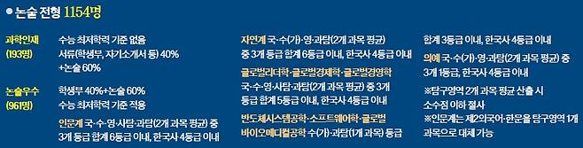 또 다른 논술 전형인 과학인재 전형에서는 자연계열 학생을 대상으로 이공계 수학·과학 우수인재를 선발한다. 수능 최저학력 기준은 없고 학생부와 자소서 등 서류 40%와 논술 60%를 반영한다. 논술우수 전형은 수능 이후 시험을 보는 반면 과학인재 전형은 수능 전인 10월 1일 시험을 치르기 때문에 염두에 두고 지원해야 한다.