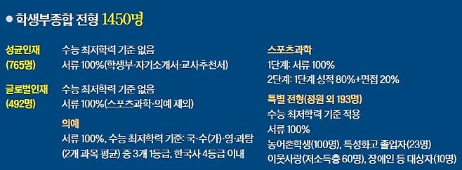 서류 100% 선발, 의예과만 수능 최저학력 기준 적용성균관대는 2017학년도 수시모집에서 학생부종합 전형으로 1257명(정원 외 특별전형 제외)을 선발한다. 성균인재 전형 765명, 글로벌인재 전형 492명 등이다. 두 전형의 차이는 모집 단위에 있다. 성균인재 전형은 계열모집, 글로벌인재 전형은 학과모집을 한다. 지원자는 두 전형에 모두 지원할 수 있다. 입학사정관들은 학생부의 교과·비교과 영역을 정성적·종합적으로 평가한다. 글로벌인재 전형의 의예과를 제외한 두 전형 모두 수능최저학력 기준 없이 서류 100%로 뽑는다.