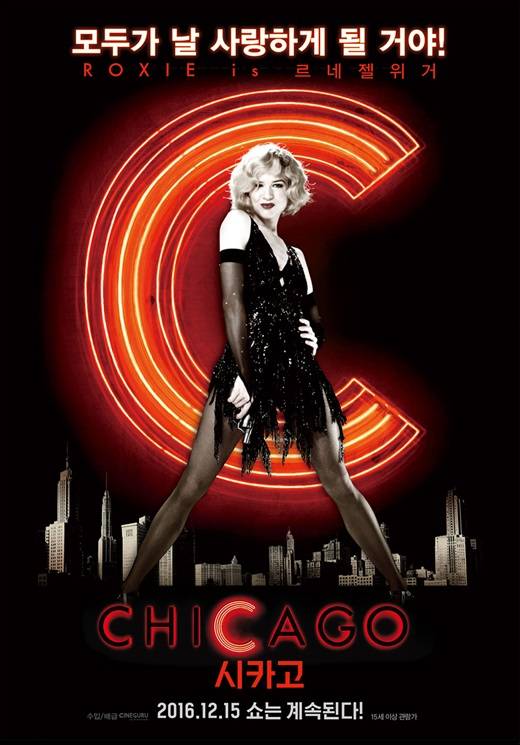 '시카고' 측은 21일 르네 젤위거가 맡은 록시 역의 캐릭터 포스터를 선보였다. 록시는 우발적으로 벌인 살인이 오히려 스타가 될 절호의 찬스가 된 아이러니한 인물이다.