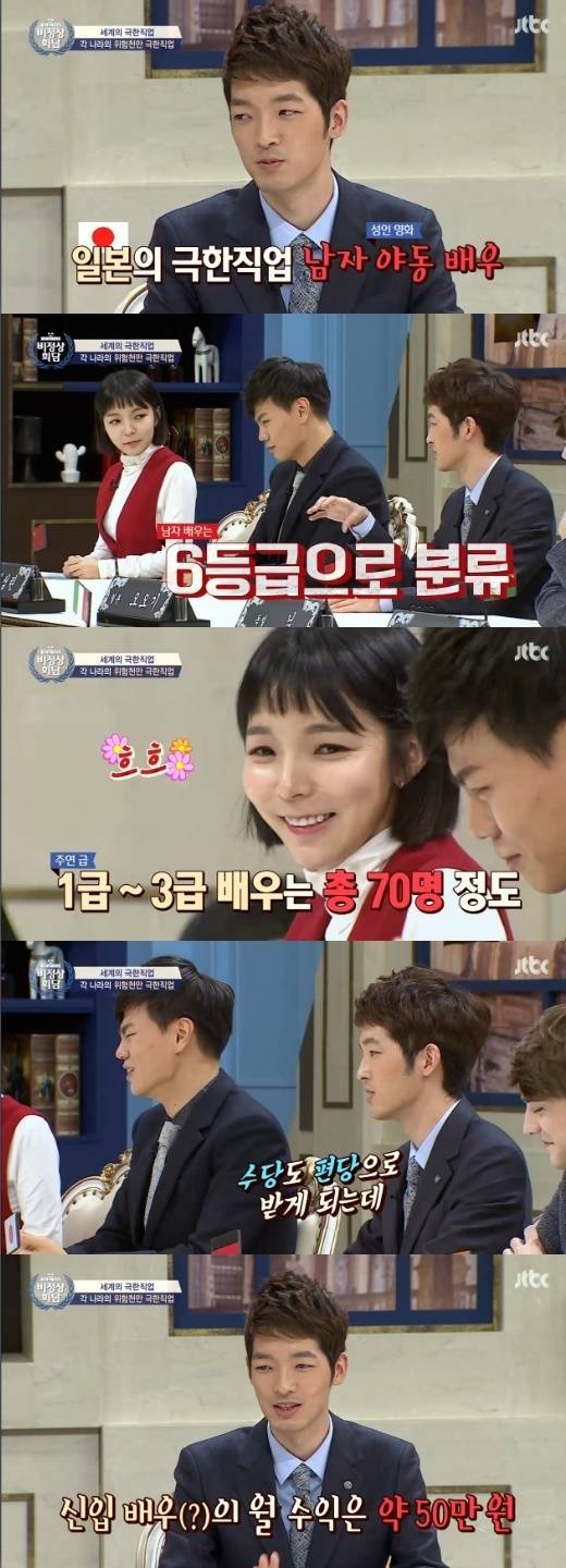 특히 일본 대표 오오기는 "일본의 극한직업은 남자 야동배우다. 남자는 등급이 있다. 여자 배우에 비해 남자 배우가 별로 없다. 인지도 있는 배우는 극소수다. 나머지는 주변에 있는 사람들이다. 수당도 신입 배우 같은 경우는 편당 5만 원이다"라고 전해 놀라움을 자아냈다.