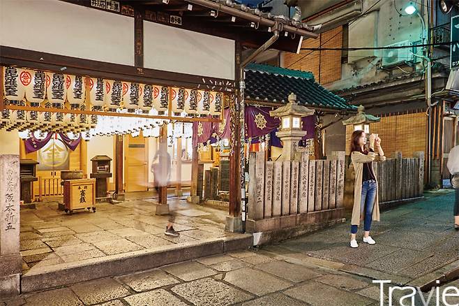 도톤보리의 상징이 되어 버린 대형 간판 조형물에 시선이 팔려 인파에 밀려 다니다 보면 대부분 도톤보리의 메인 거리에서 시간을 다 쓰게 되지만 한 블록만 벗어나 보자. 갑자기 골목의 느낌이 호젓해지고 붉은 초롱을 내건 아기자기한 식당과 주점들이 보인다면 이미 호젠지요코초(法善寺横丁)에 도착한 것이다. 일본의 옛 정취가 물씬 느껴진다. 확실히 해두고 싶다면 호젠지라는 절을 찾으면 된다. 60여 개나 되는 식당과 주점을 찾는 손님들과 잠시 휴식시간을 맞은 점원들이 멈춰 서서 부동명왕상에 물을 끼얹으며 소원을 비는 장면을 볼 수 있다.