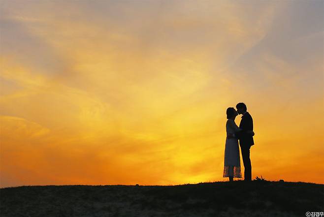 사실 노출차를 줄인다는 것은 전문적인 기술이다. 브라케팅이니 ND그라데이션 필터니 이런 용어들이 너무나 어렵다면 일몰시 실루엣 사진에 집중하는 게 더 좋다. 또한 실제로 전문가들도 많이 찍게 되는 것이 실루엣 사진이다. 제주 협재해변에서 촬영한 이 커플의 사진은 언덕 위에 커플이 올라가 있고 촬영자는 밑에서 촬영해, 두 사람의 실루엣이 노을 속에 도드라지도록 표현한 사진이다. 이렇게 하늘을 제외한 부분이 까맣게 실루엣으로 표현되는 사진은 누구나 스마트폰 정도로도 충분히 촬영할 수 있다.