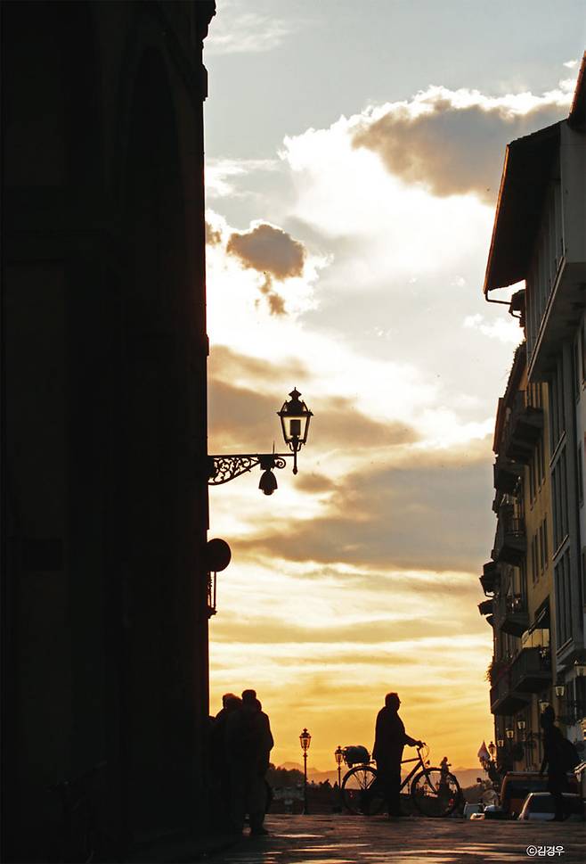 앞의 기요미즈데라 사진처럼 촬영자가 위에서 찍고 있고 또 단풍이나 건물의 질감 또한 함께 살려야 할 경우라면 노출차를 줄이기 위해 브라케팅이나 ND그라데이션 필터를 사용하는 게 좋다. 하지만 거리나 골목, 광장, 바다, 들판 등 촬영자가 낮은 위치에 있고 해 지는 방향에 높은 건물이나 피사체가 있다면? 이럴 때는 굳이 노출차를 고민하지 말고 그런 피사체를 실루엣으로 표현해 보자. 노을이 지는 멋진 하늘에 실루엣이 걸쳐지면 도드라져 보이기에 실루엣만으로도 그 건물이나 피사체가 무엇인지 알 수 있다. 스마트폰의 카메라로도 쉽게 촬영할 수 있으며 여행에서 어쩌면 가장 많이 찍게 되는 노을 촬영의 방식이다. 이때 가장 중요한 것은 앵글이다. 촬영자가 낮게 몸을 숙일수록 노을이 지는 하늘에 실루엣이 더 도드라지게 걸쳐지는 것은 당연지사. 체면 따윈 무시하고 아예 땅바닥에 누워 찍어도 된다.
