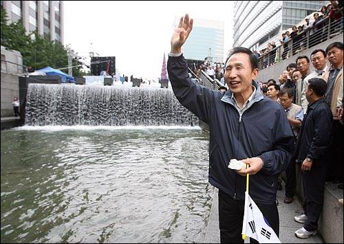| ▲ 지난 2007년 9월 30일 오후 '2007 청계천 축제'가 열리는 청계천을 방문한 당시 이명박 한나라당 대선후보가 시민들을 향해 손을 흔들고 있다. |