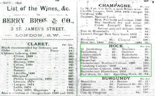 | 1896년 런던에서 거래된 와인의 가격표. HOCK로 표시된 것이 독일 와인 가격이다. |
