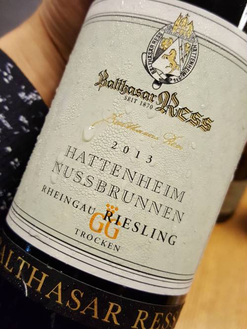 하튼하임 누스브루넌 라인가우 리슬링 그로세스 게벡스 트로켄 (Hattenheim Nussbrunnen Rheingau Riesling GG Trocken) 2013은 최상위 등급 포도밭인 그로세 라게 포도로 빚은 와인이다. 그로스 라게 등급의 드라이한 와인은 그로세스 게벡스라고 한다.