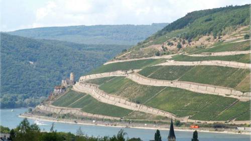 | 가파른 경사로에 있는 라인가우 포도밭 전경. |