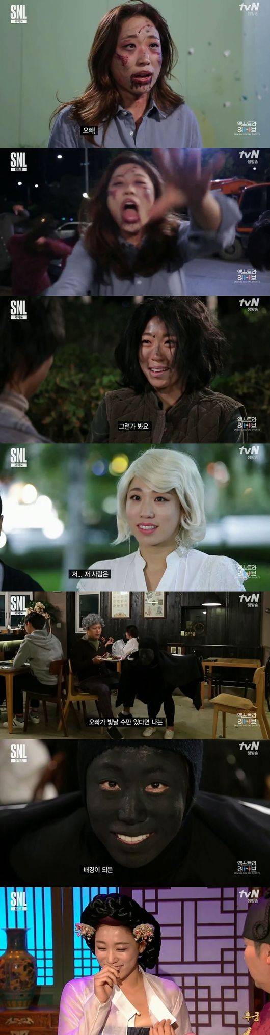 '엑스트라 러브'에서는 김민교와 사랑을 나누는 엑스트라 커플이었다. 거지, 좀비, 외국인 등의 모습은 물론 이후 마음이 상한 김민교를 위해 테이블로 변한 모습으로 폭소케했다.