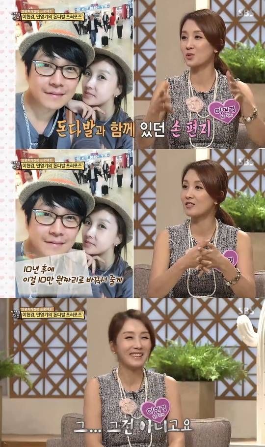 이현경은 남편이 색다른 프러포즈를 했다며 "천 원 짜리 천 장이 든 박스로 프러포즈 했다. 10년 후에는 천 원을 십 만원 짜리로 만들어 주겠다고 했다. 3년 남았다"고 너스레를 떨어 웃음을 자아냈다.(사진=SBS 방송 캡처)