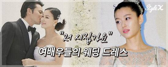 대부분의 여자들은 '웨딩드레스'에 대한 로망이 있다. 이제는 아름다운 가정을 이룬 여배우들의 웨딩드레스를 살펴보자. 고소영은 'sweetsheart' 라인의 네크라인 & A 라인의 드레스를 입었다. 전지현의 이브닝드레스는 '제니팩햄'의 드레스이다. (당시 본식 드레스가 아니라는 얘기에 팬들은 안도했다는 소문이...) 심플한 A 라인 드레스에 화려한 크리스털 볼레로를 레이어드해 여신이 귀환한 듯하다. 한혜진은 'illusion'과 핏되는 머메이드라인의 드레스를 선택했다.