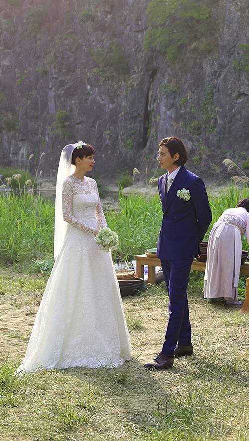 이나영은 팔 전체를 가리는 'illusion' 네크라인의 드레스이다. 바람에 살랑이는 갈대와 은은하게 비치는 드레스가 완벽하게 조화롭다. 게다가 들꽃으로 만든 부케와 티아라는 화려하지 않아서 더 아름답다.