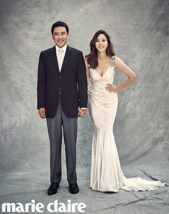 마리끌레르에서 공개한 김승우와 김남주의 리마인드 웨딩 컷이다. 본식에 입었던 드레스를 착용해 눈길을 끌었다. 깊게 파인 V 네크라인과 머메이드라인의 베라왕 드레스로 당시