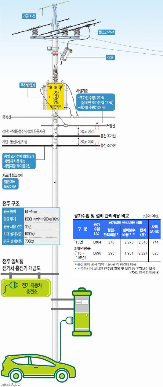 그깟 전봇대라고 깔보면 안 됩니다. 들어가는 돈도 어마어마합니다. 한국전력은 지난해 점검과 관리비용으로 270억원을 썼고 설비 보수하는 데 2278억원을 사용했습니다. 물론 한전이 전주로 벌어들이는 돈은 있습니다. 통신사나 케이블TV 사업자가 통신망을 연결할 때 전봇대를 빌려주고 이용료를 받는 것이죠. 그런데 지난해 이용료 수입이 1804억원이었으니 적자입니다. 무단으로 사용하는 사업자들 때문이라고 하네요.