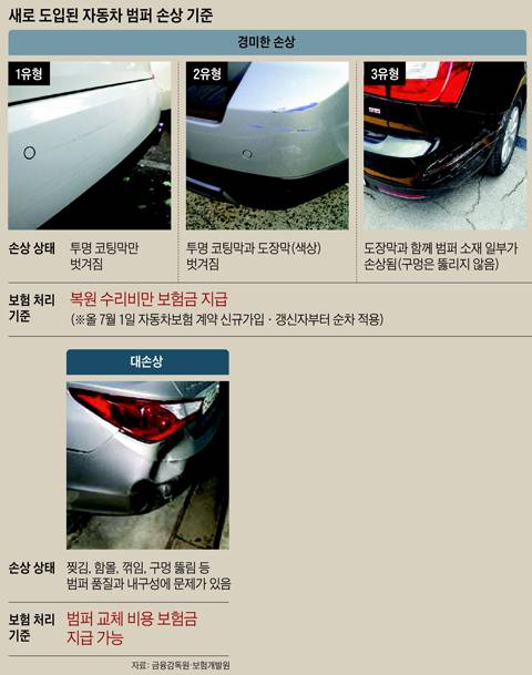 보험개발원 산하 자동차기술연구소가 마련한 차량 손상 기준을 보면 ▲차량 범퍼의 투명 코팅막만 벗겨진 경우(제1유형), ▲투명 코팅막과 도장 막(색상)이 동시에 벗겨진 경우(제2유형) ▲도장막과 함께 범퍼 소재의 일부가 긁히거나 찍힌 경우(제3유형)까지가 '경미(輕微) 손상'에 속한다. 이때는 범퍼를 그대로 달아놓은 채 광택 작업만 하거나 떼어낸 후 페인트를 다시 칠하는 등의 작업을 거치게 된다.
