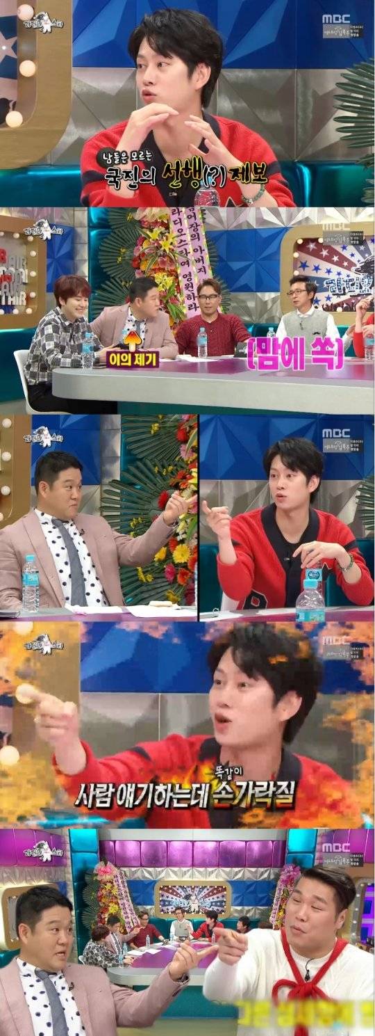김희철은 “김국진은 김구라의 ‘전자발찌’ 같은 존재다. 김구라가 선을 넘지 않게 해주는 역할을 한다”고 말했다. 이에 김구라는 언짢은 듯한 표정을 지었다. 그러면서 손가락질을 했다.