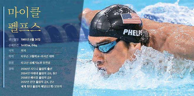 펠프스는 ‘올림픽 역사상 가장 위대한 올림피언’으로 불린다. 2000년 시드니 올림픽을 시작으로 2004년 아테네 올림픽, 2008년 베이징 올림픽, 2012년 런던 올림픽에 참가했다. 15세에 출전한 시드니 올림픽에서는 메달을 따지 못했지만 아테네 올림픽부터 메달을 휩쓸기 시작했다. 베이징 대회에서는 단일 올림픽 최다 기록인 8관왕에 올랐다. 4번의 올림픽에서 접영·자유형·계영·개인혼영 등에 출전한 펠프스가 딴 메달은 모두 22개(금 18개·은 2개·동 2개)나 된다. 여름 올림픽 개인 최다 기록이다.주의력결핍 과다행동장애(ADHD)를 치료하기 위해 수영을 시작한 펠프스는 ‘인간 물고기’로 불린다. 키 1m92㎝, 몸무게 84㎏에 양팔을 펼친 길이는 2m8㎝, 발 사이즈는 350㎜다. 다리가 짧아(81㎝) 자주 넘어졌지만 수영에는 안성맞춤이었다. 수영할 때 하체는 몸통과 함께 가라앉으려는 성질이 있는데, 하체가 짧으면 물 위에 잘 뜨게 된다. 발목은 쭉 펴면 180도가 넘어갈 정도로 유연해 물고기 지느러미를 연상시킨다. 8500cc에 달하는 폐활량은 오랜 잠영을 가능하게 했다. 일반 남성의 최대 폐활량은 약 3500cc 정도다. 그런 그가 세계 수영을 제패하는 건 당연한 일이었다. 런던 올림픽에서 최다 메달 기록을 세운 펠프스는 “목표한 것을 모두 이뤘다”며 은퇴했다.