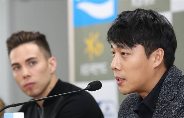 김동성과 오노는 17일 강릉 아이스 아레나에서 열린, 2016-2017 KB 국제빙상연맹(ISU) 쇼트트랙 월드컵 4차 대회가 끝난 후 기자회견장에 나란히 모습을 드러났다.