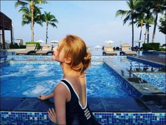 사진 속 혜리가 야외 수영장을 배경으로 포즈를 취하고 있다.
