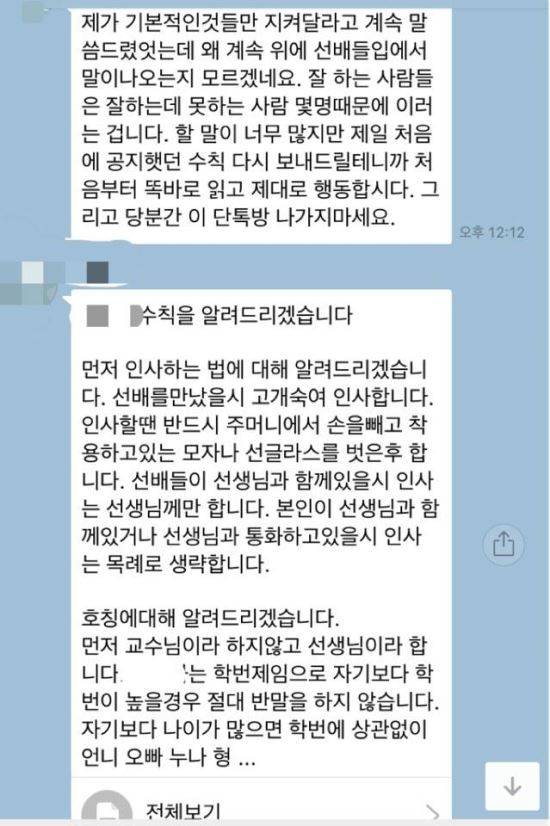 4. 후배들에게 선배를 깍듯이 대하는 법과 관련한 수칙을 강요한다.