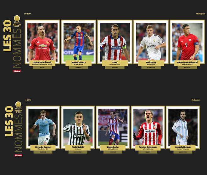 `프랑스 풋볼`은 24일 오후 5시(한국시간) 공식 홈페이지를 통해 발롱도르 후보 30인 중 첫 5인을 발표했다.